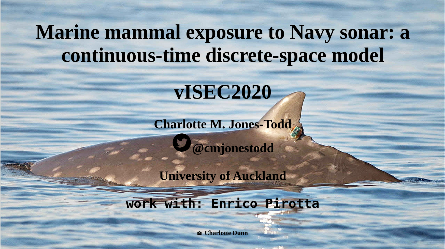 @cmjonestodd]] <hr> *Continuous-time discrete-space models of marine mammal exposure to Navy sonar.* (under review) Jones-Todd, C. M., Pirotta, E., Baird, R. W., Durban, J. W., Falcone, E. A., Joyce, T. W., Schorr, G. S., Watwood, S., & Thomas, L. <hr> .center[.card[  [cmjt.github.io/slides/visec2020](https://cmjt.github.io/slides/visec2020) ] ] ]